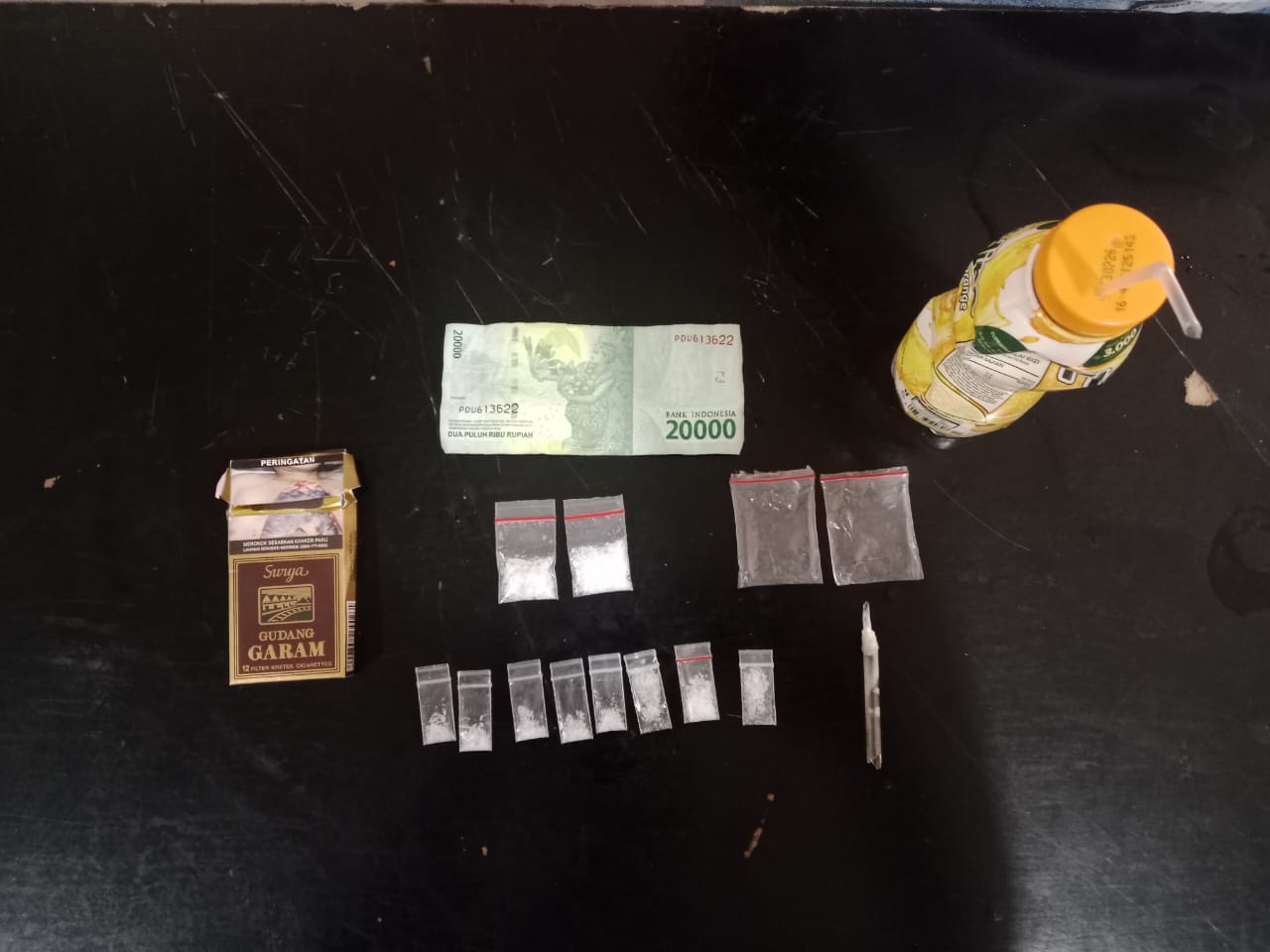 Total barang bukti yang diamankan meliputi 8 paket plastik klip kecil dan 2 paket plastik klip sedang berisi sabu dengan berat keseluruhan bruto 3,55 gram, 2 buah plastik klip besar kosong, 1 kotak rokok, 1 alat hisap sabu yang terbuat dari botol plastik, 1 buah kaca pirex, dan uang tunai sebesar Rp 20.000.